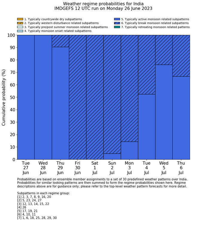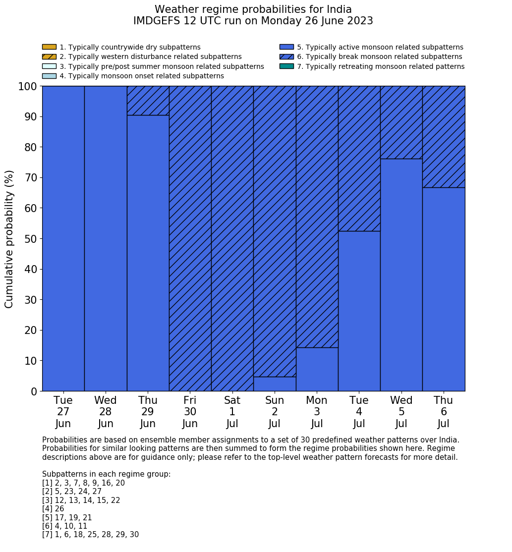 | Weather patterns typically associated with summer monsoon tendencies over India are most likely Weather patterns 12, 13, 15, 15 and 22 (pre/post summer monsoon); 26 (onset); 17, 19 and 21 (active); 4, 10 and 11 (break) | |