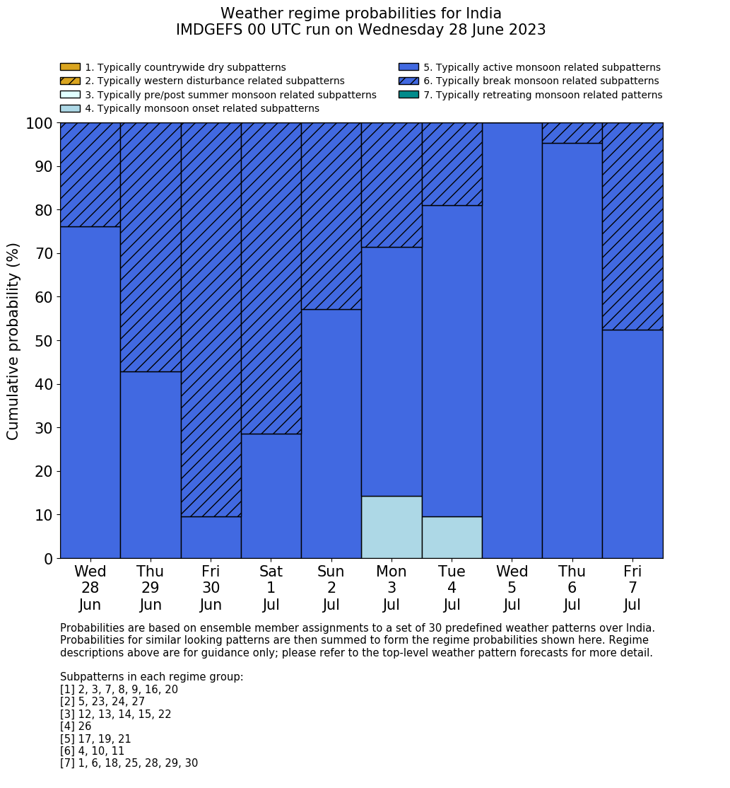 | Weather patterns typically associated with summer monsoon tendencies over India are most likely Weather patterns 12, 13, 15, 15 and 22 (pre/post summer monsoon); 26 (onset); 17, 19 and 21 (active); 4, 10 and 11 (break) | |