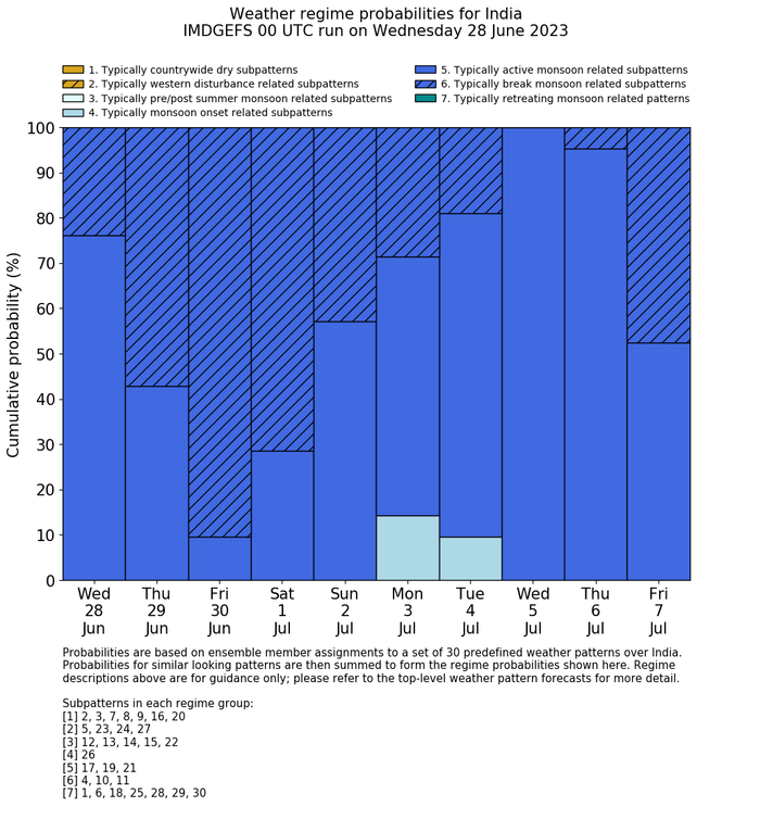 | Weather patterns typically associated with summer monsoon tendencies over India are most likely Weather patterns 26 (onset); 17, 19 and 21 (active); 4, 10 and 11 (break) |