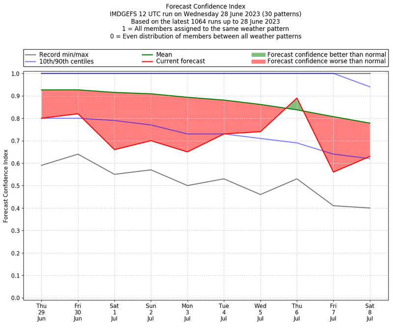 | Weather patterns typically associated with contrywide dry period tendencies over India are most likely Weather patterns 2, 3, 7, 8, 9, 16 and 20 (countrywide winter dry period) | |