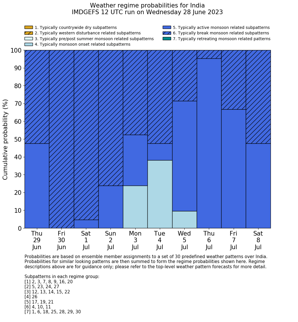 | Weather patterns typically associated with summer monsoon tendencies over India are most likely Weather patterns 12, 13, 15, 15 and 22 (pre/post summer monsoon); 26 (onset); 17, 19 and 21 (active); 4, 10 and 11 (break) | |