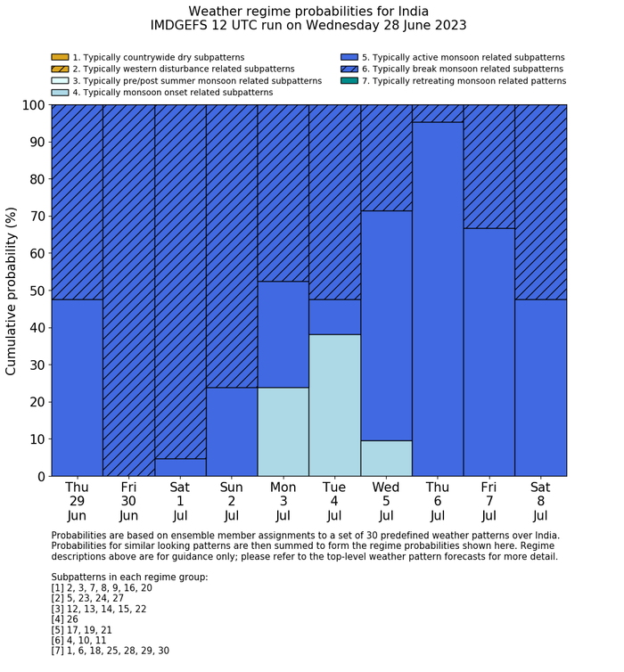 | Weather patterns typically associated with active monsoon tendencies over India are most likely Weather patterns 17, 19 and 21 (active) |