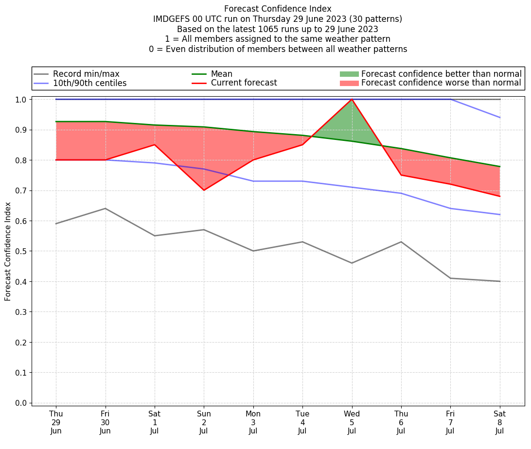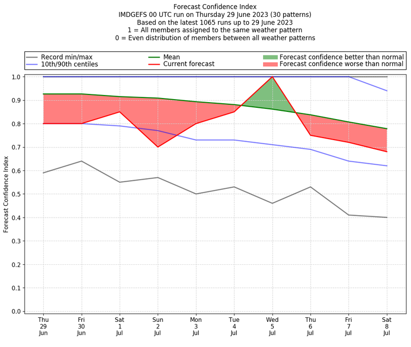 | Weather patterns typically associated with contrywide dry period tendencies over India are most likely Weather patterns 2, 3, 7, 8, 9, 16 and 20 (countrywide winter dry period) | |
