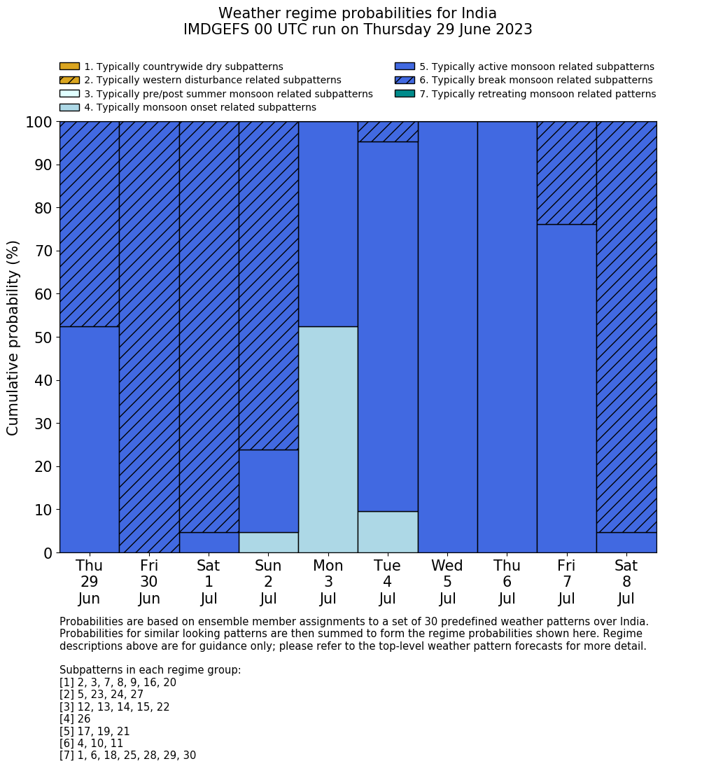 | Weather patterns typically associated with summer monsoon tendencies over India are most likely Weather patterns 12, 13, 15, 15 and 22 (pre/post summer monsoon); 26 (onset); 17, 19 and 21 (active); 4, 10 and 11 (break) | |