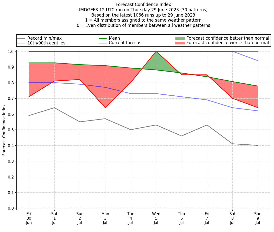 | Weather patterns typically associated with contrywide dry period tendencies over India are most likely Weather patterns 2, 3, 7, 8, 9, 16 and 20 (countrywide winter dry period) | |