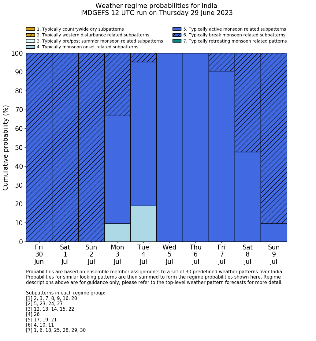 | Weather patterns typically associated with active monsoon tendencies over India are most likely Weather patterns 17, 19 and 21 (active) |