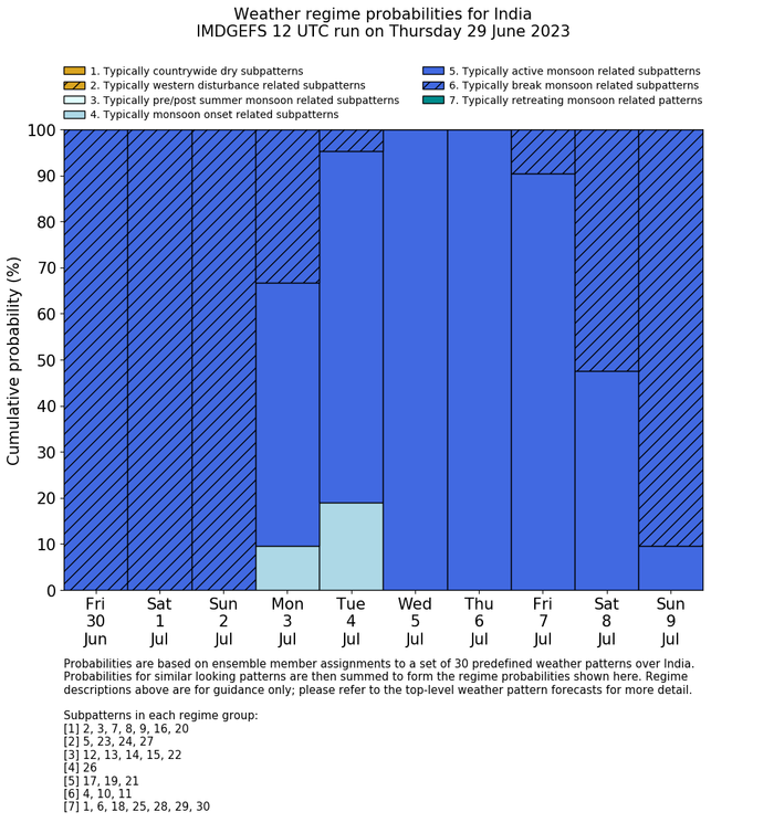 | Weather patterns typically associated with summer monsoon tendencies over India are most likely Weather patterns 12, 13, 15, 15 and 22 (pre/post summer monsoon); 26 (onset); 17, 19 and 21 (active); 4, 10 and 11 (break) | |