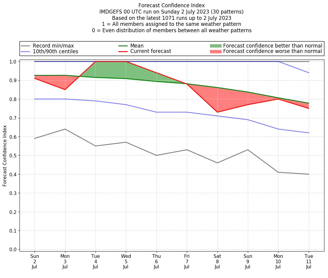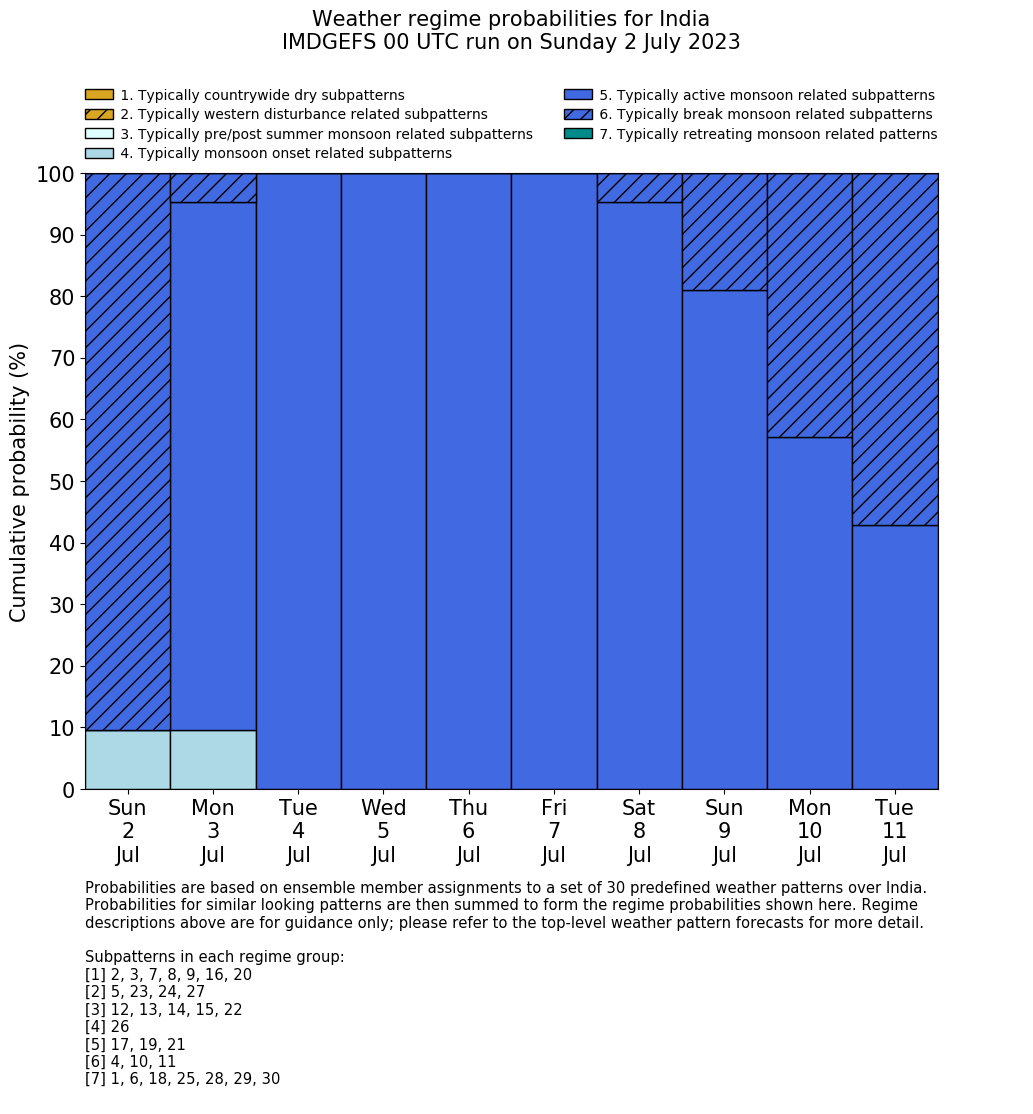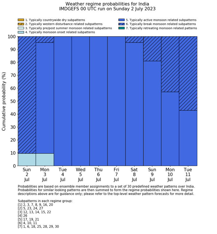 | Weather patterns typically associated with contrywide dry period tendencies over India are most likely Weather patterns 2, 3, 7, 8, 9, 16 and 20 (countrywide winter dry period) | |