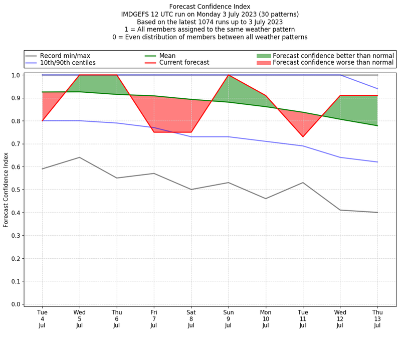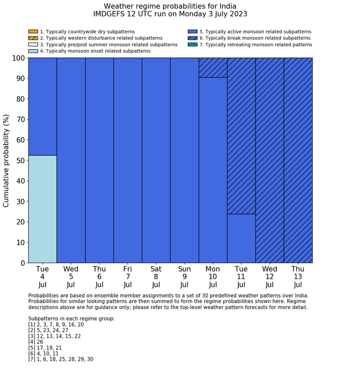 | Weather patterns typically associated with summer monsoon tendencies over India are most likely Weather patterns 12, 13, 15, 15 and 22 (pre/post summer monsoon); 26 (onset); 17, 19 and 21 (active); 4, 10 and 11 (break) | |