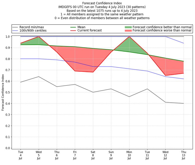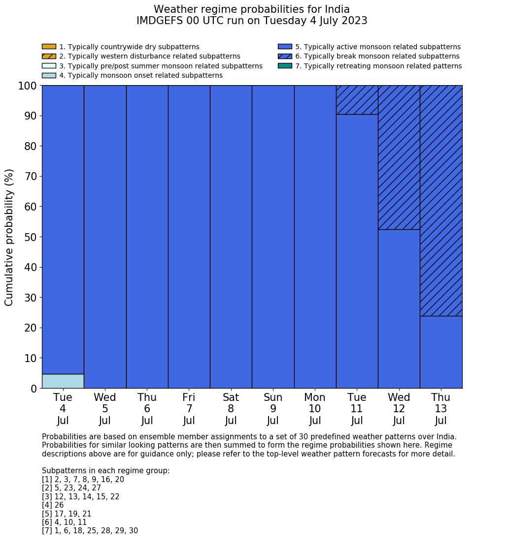 | Weather patterns typically associated with break monsoon tendencies over India are most likely Weather patterns 4, 10 and 11 (break) | |