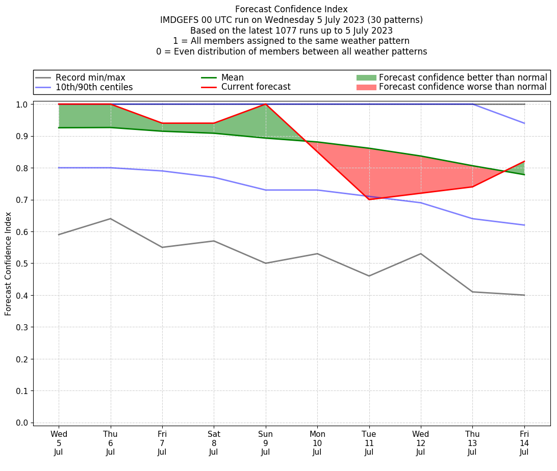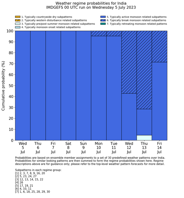 | Weather patterns typically associated with contrywide dry period tendencies over India are most likely Weather patterns 2, 3, 7, 8, 9, 16 and 20 (countrywide winter dry period) | |