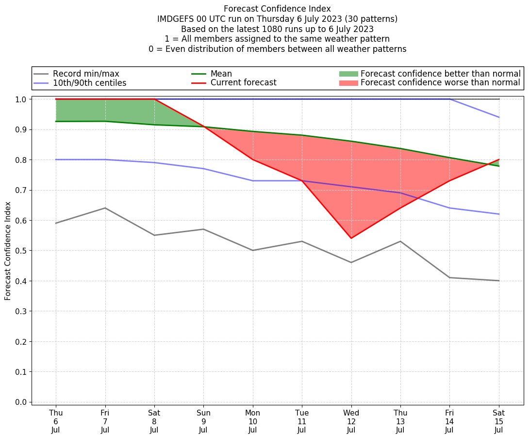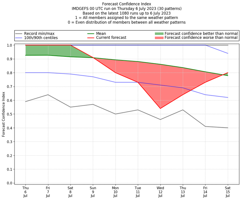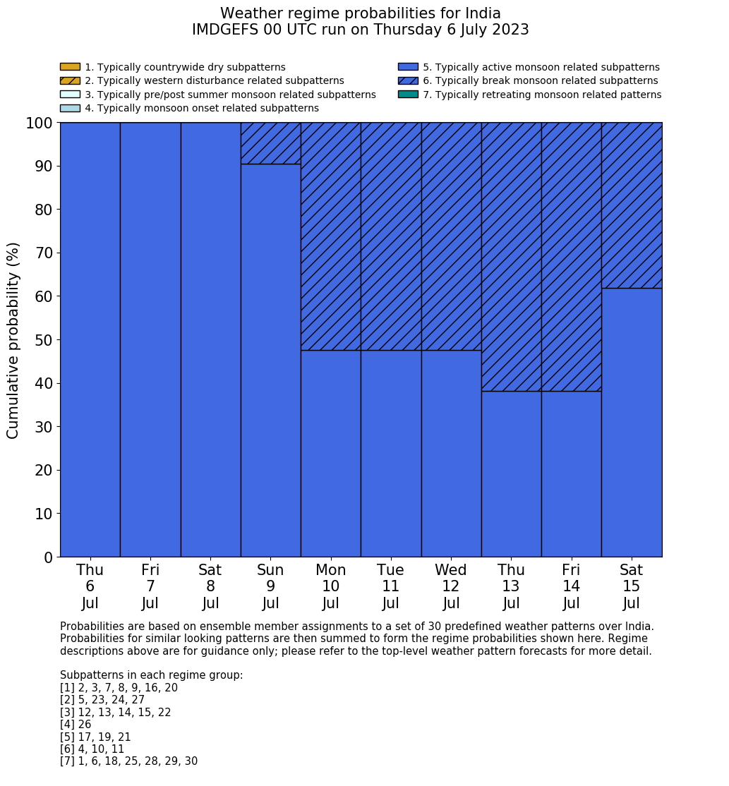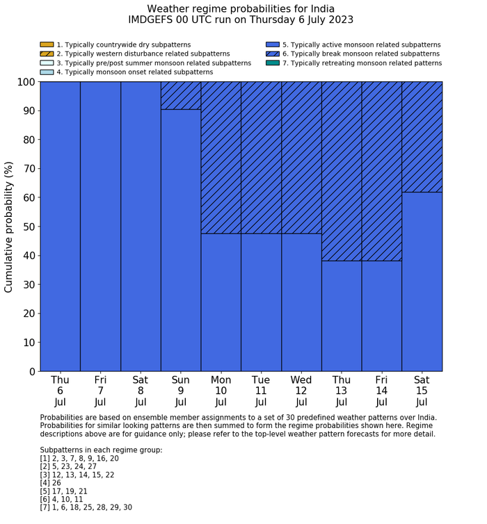 | Weather patterns typically associated with contrywide dry period tendencies over India are most likely Weather patterns 2, 3, 7, 8, 9, 16 and 20 (countrywide winter dry period) | |