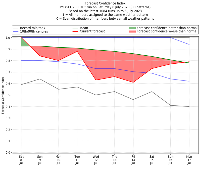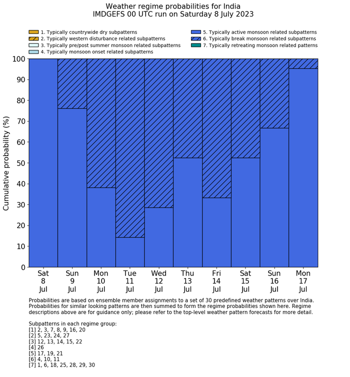 | Weather patterns typically associated with contrywide dry period tendencies over India are most likely Weather patterns 2, 3, 7, 8, 9, 16 and 20 (countrywide winter dry period) | |