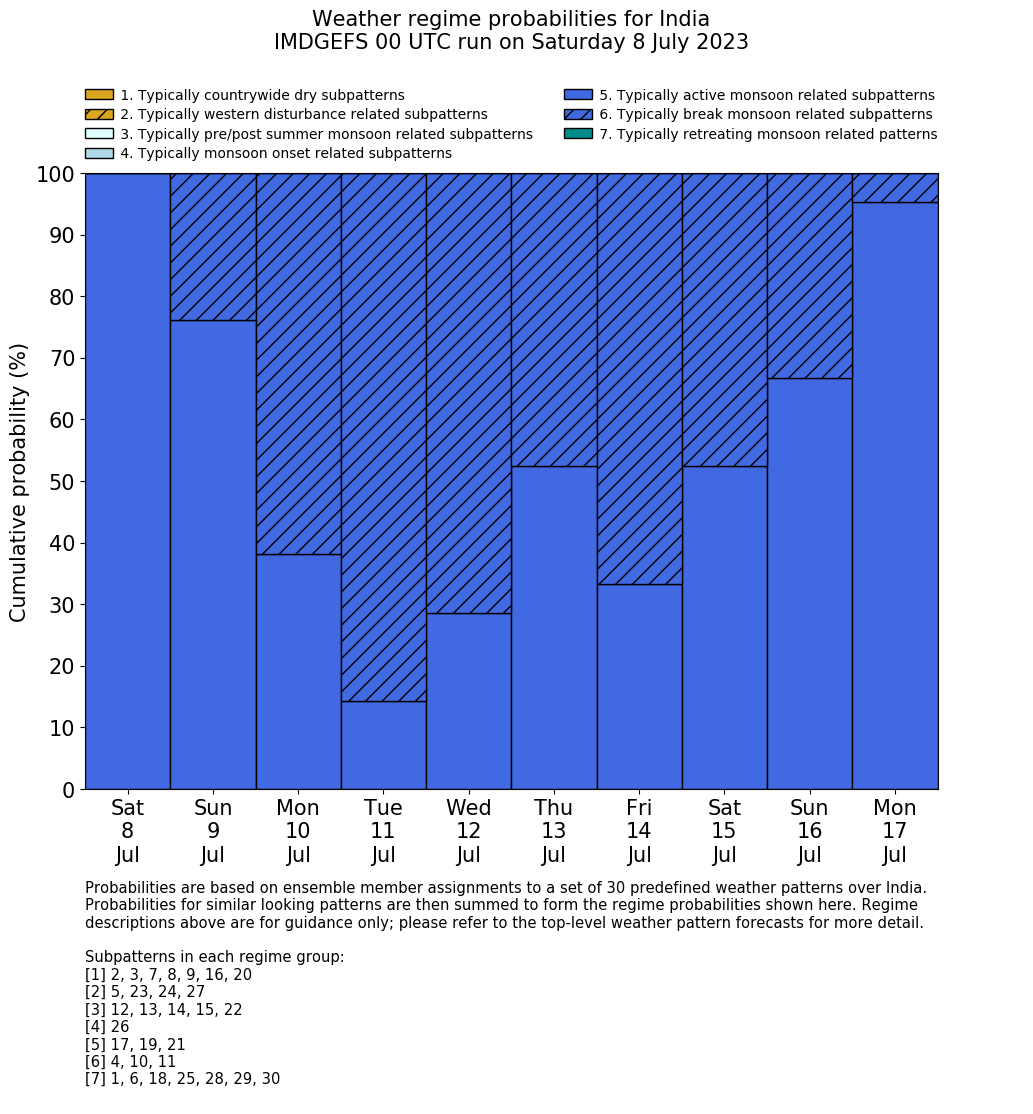 | Weather patterns typically associated with summer monsoon tendencies over India are most likely Weather patterns 26 (onset); 17, 19 and 21 (active); 4, 10 and 11 (break) |