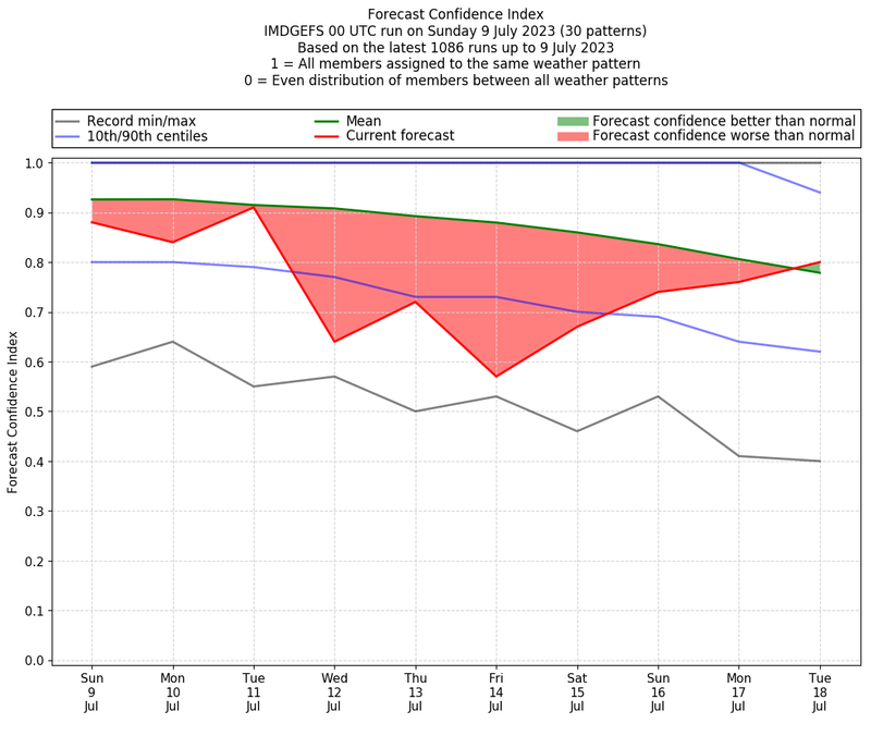 | Weather patterns typically associated with contrywide dry period tendencies over India are most likely Weather patterns 2, 3, 7, 8, 9, 16 and 20 (countrywide winter dry period) | |