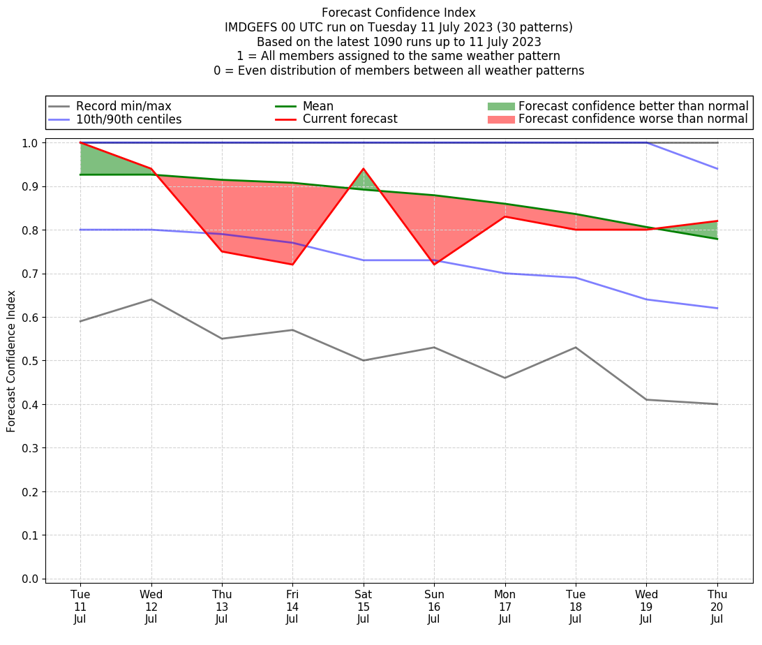 | Weather patterns typically associated with contrywide dry period tendencies over India are most likely Weather patterns 2, 3, 7, 8, 9, 16 and 20 (countrywide winter dry period) | |