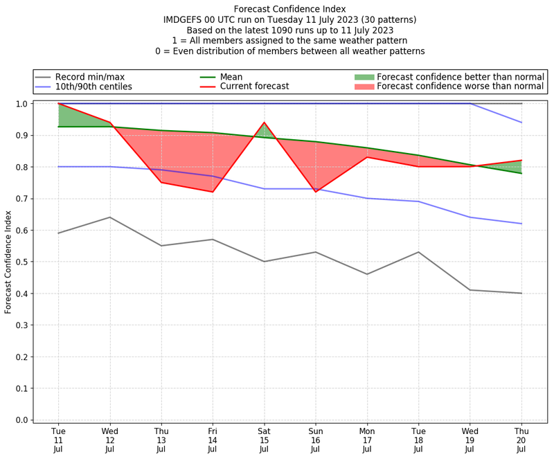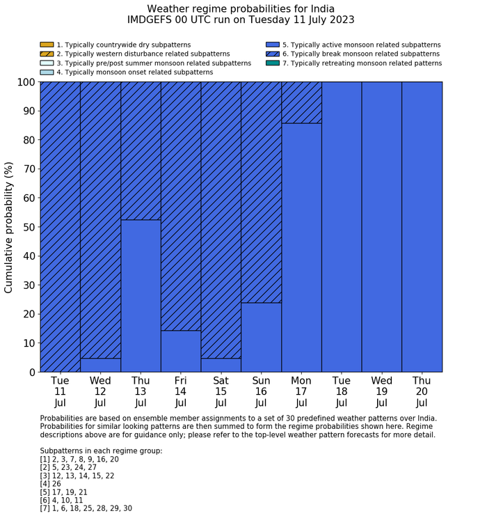 | Weather patterns typically associated with break monsoon tendencies over India are most likely Weather patterns 4, 10 and 11 (break) | |