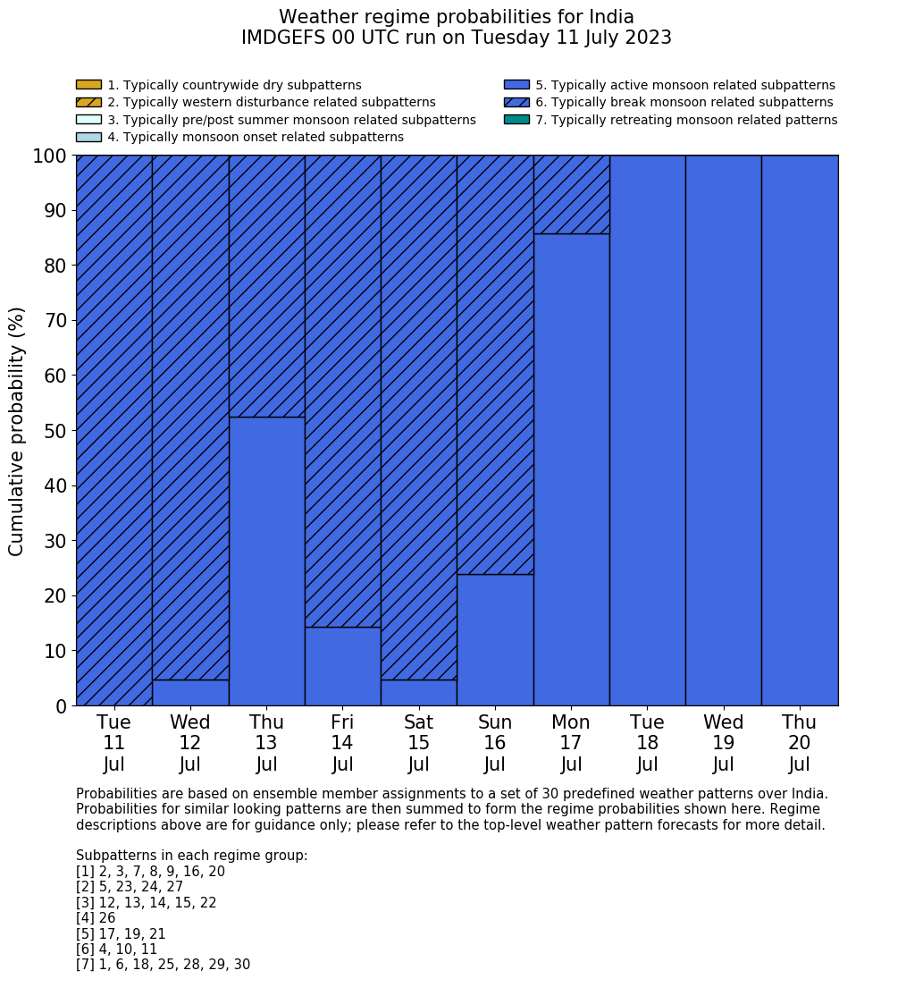 | Weather patterns typically associated with active monsoon tendencies over India are most likely Weather patterns 17, 19 and 21 (active) |