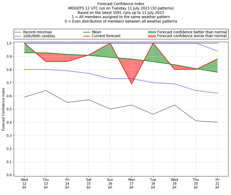 | Weather patterns typically associated with break monsoon tendencies over India are most likely Weather patterns 4, 10 and 11 (break) | |