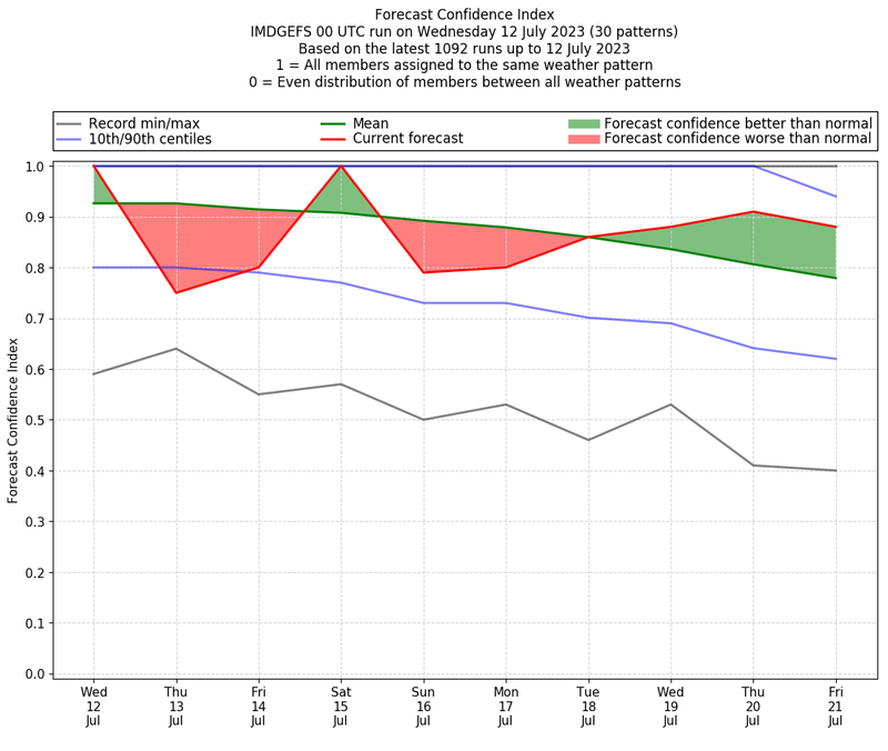 | Weather patterns typically associated with contrywide dry period tendencies over India are most likely Weather patterns 2, 3, 7, 8, 9, 16 and 20 (countrywide winter dry period) | |