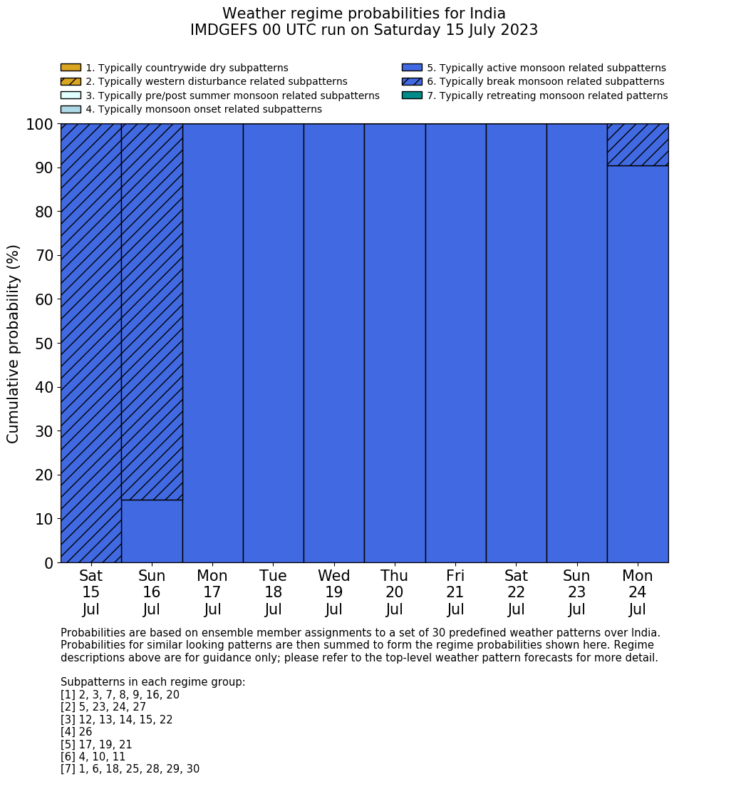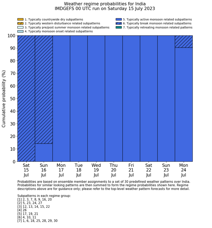 | Weather patterns typically associated with active monsoon tendencies over India are most likely Weather patterns 17, 19 and 21 (active) |