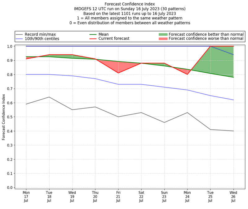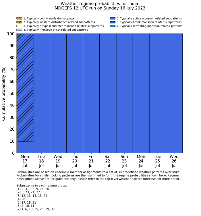 | Weather patterns typically associated with contrywide dry period tendencies over India are most likely Weather patterns 2, 3, 7, 8, 9, 16 and 20 (countrywide winter dry period) | |