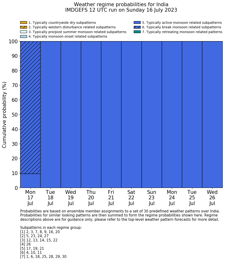 | Weather patterns typically associated with summer monsoon tendencies over India are most likely Weather patterns 12, 13, 15, 15 and 22 (pre/post summer monsoon); 26 (onset); 17, 19 and 21 (active); 4, 10 and 11 (break) | |