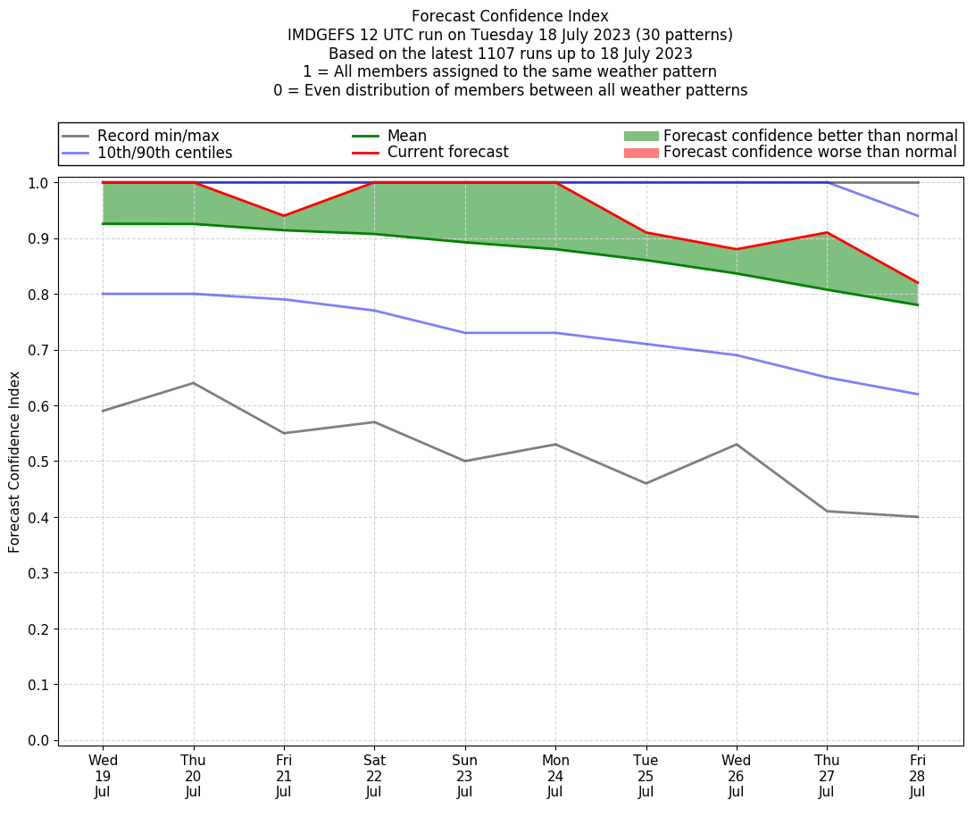 | Weather patterns typically associated with contrywide dry period tendencies over India are most likely Weather patterns 2, 3, 7, 8, 9, 16 and 20 (countrywide winter dry period) | |