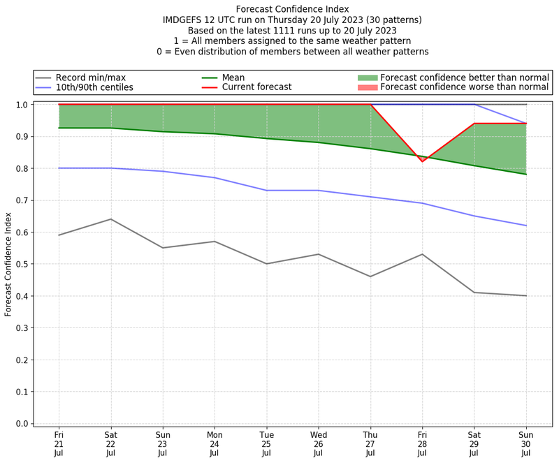 | Weather patterns typically associated with contrywide dry period tendencies over India are most likely Weather patterns 2, 3, 7, 8, 9, 16 and 20 (countrywide winter dry period) | |