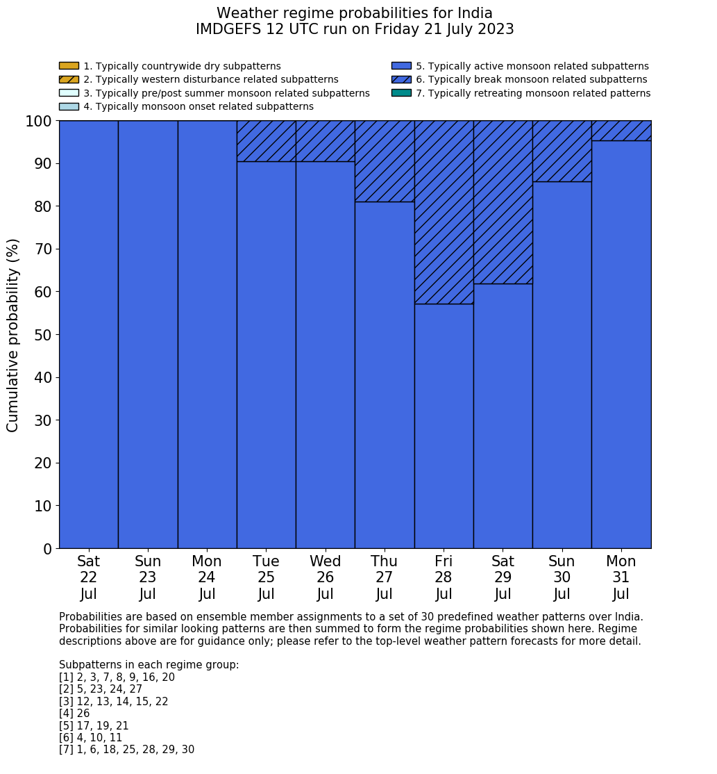| Weather patterns typically associated with summer monsoon tendencies over India are most likely Weather patterns 12, 13, 15, 15 and 22 (pre/post summer monsoon); 26 (onset); 17, 19 and 21 (active); 4, 10 and 11 (break) | |