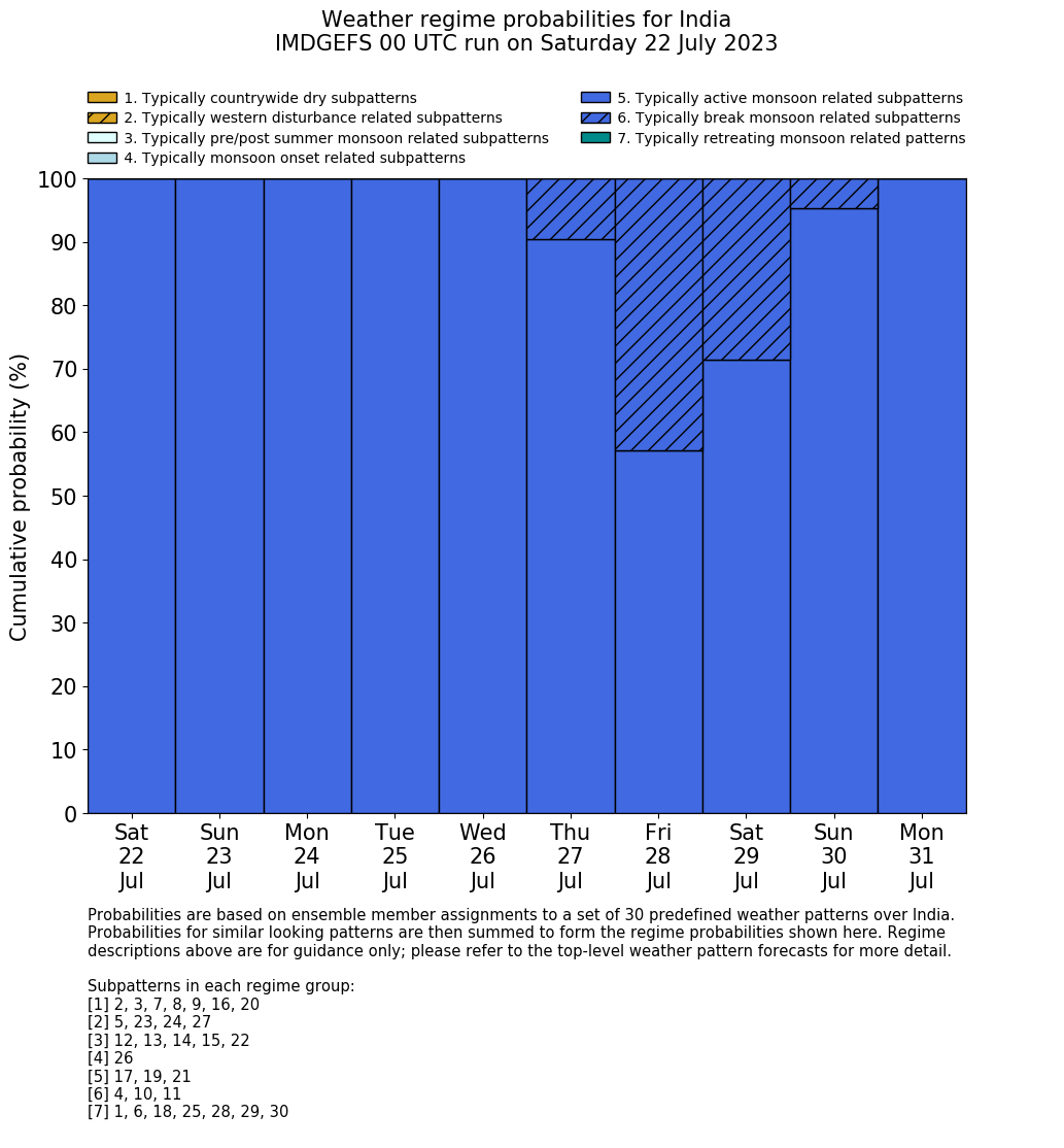 | Weather patterns typically associated with summer monsoon tendencies over India are most likely Weather patterns 12, 13, 15, 15 and 22 (pre/post summer monsoon); 26 (onset); 17, 19 and 21 (active); 4, 10 and 11 (break) | |