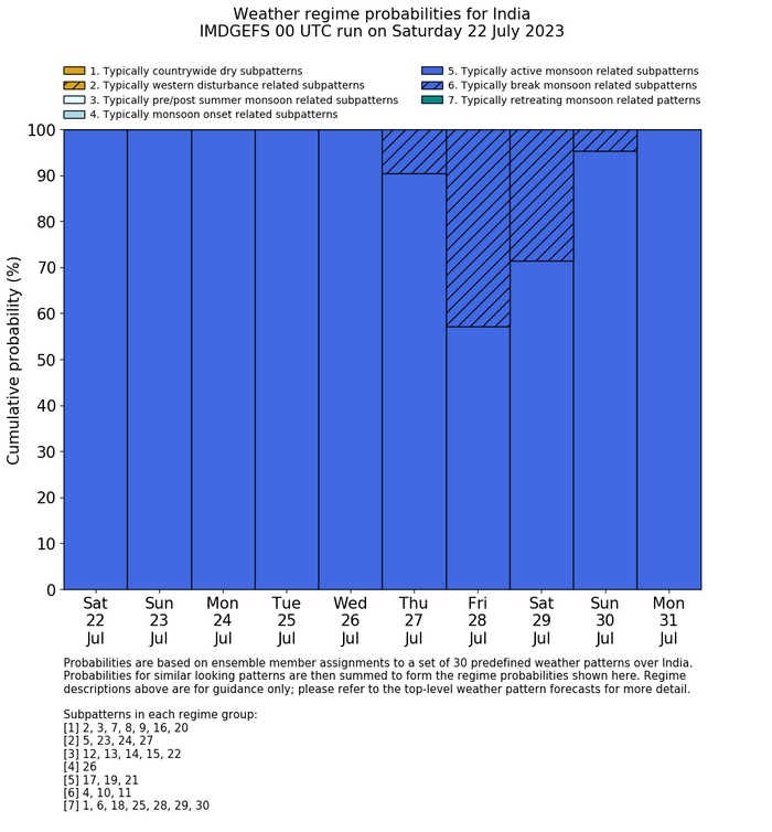 | Weather patterns typically associated with contrywide dry period tendencies over India are most likely Weather patterns 2, 3, 7, 8, 9, 16 and 20 (countrywide winter dry period) | |