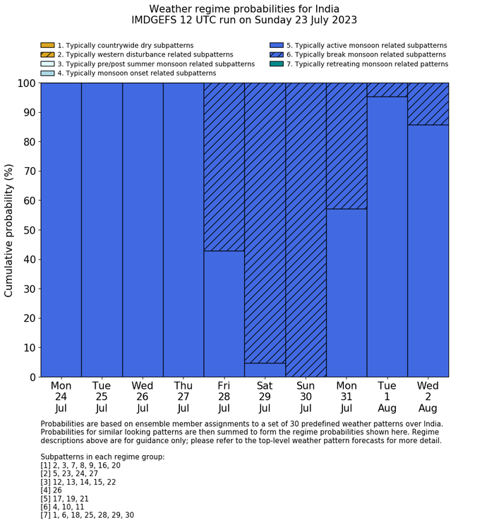 | Weather patterns typically associated with contrywide dry period tendencies over India are most likely Weather patterns 2, 3, 7, 8, 9, 16 and 20 (countrywide winter dry period) | |
