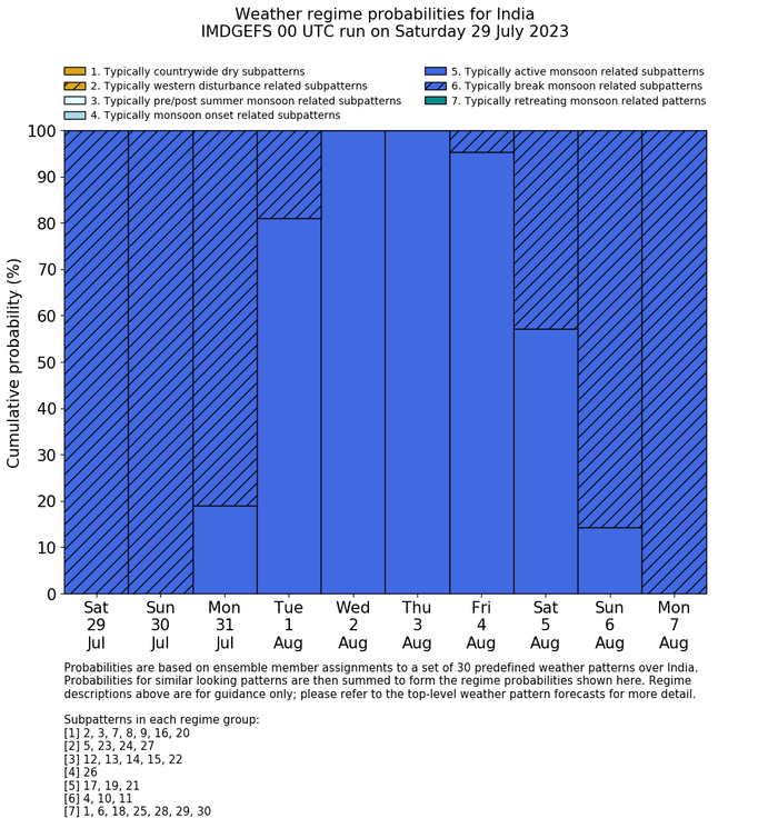 | Weather patterns typically associated with contrywide dry period tendencies over India are most likely Weather patterns 2, 3, 7, 8, 9, 16 and 20 (countrywide winter dry period) | |