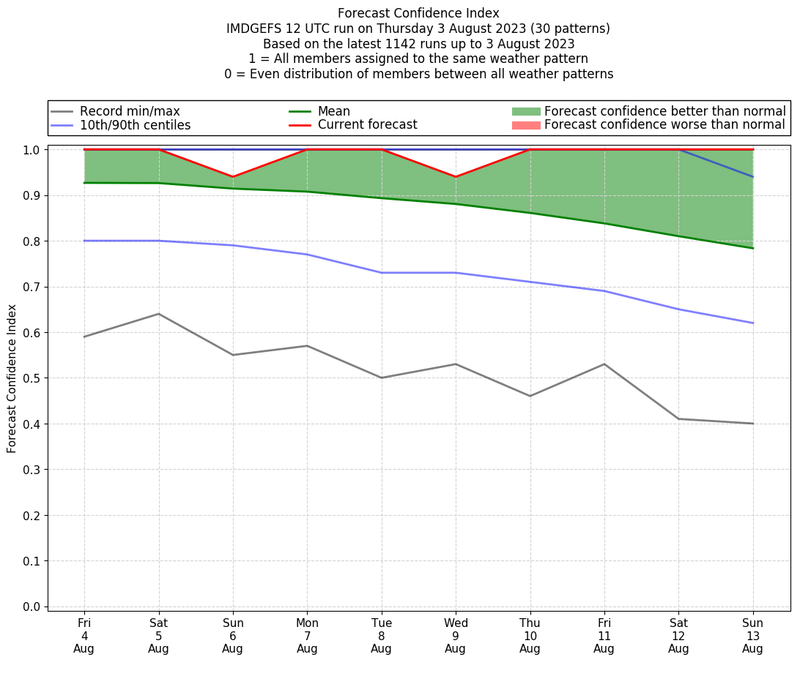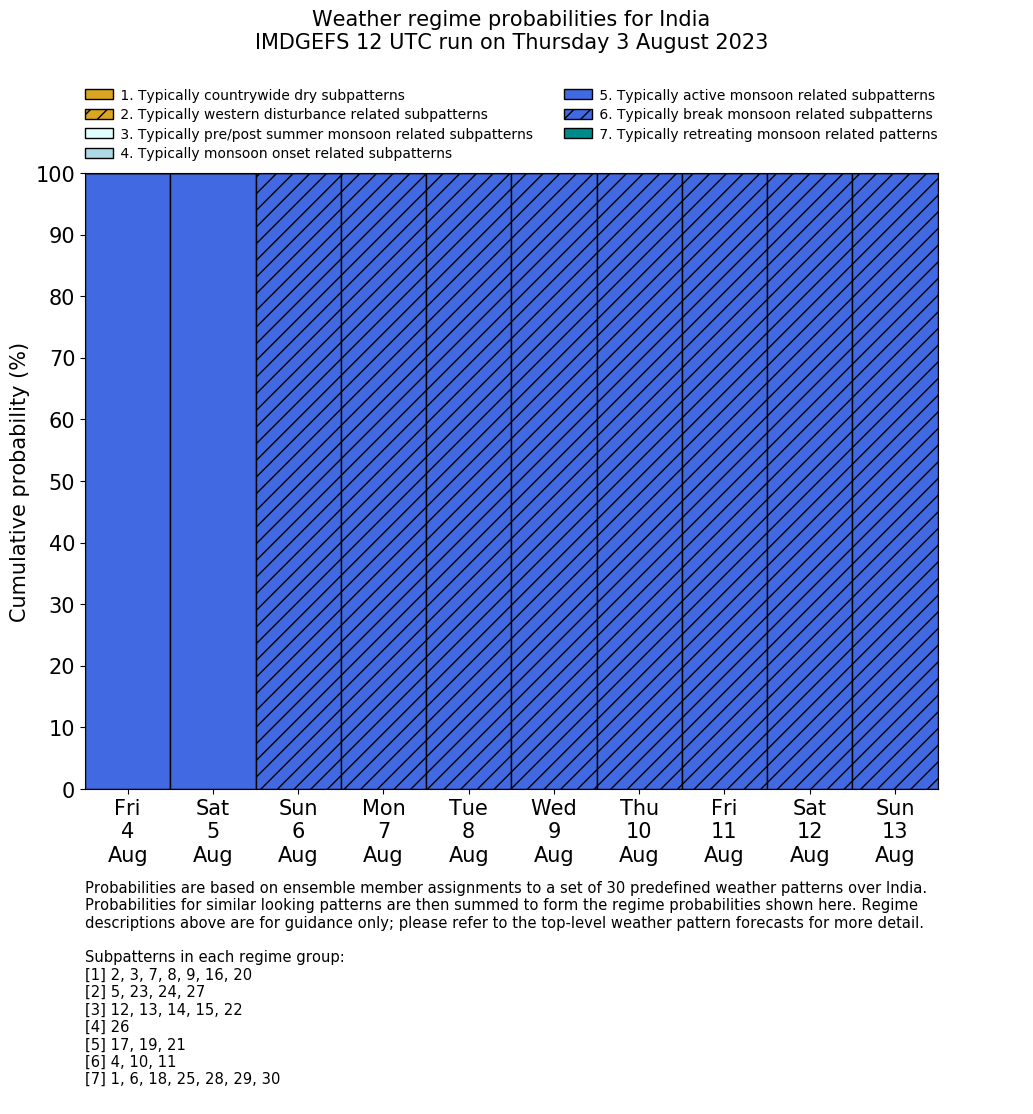 | Weather patterns typically associated with contrywide dry period tendencies over India are most likely Weather patterns 2, 3, 7, 8, 9, 16 and 20 (countrywide winter dry period) | |