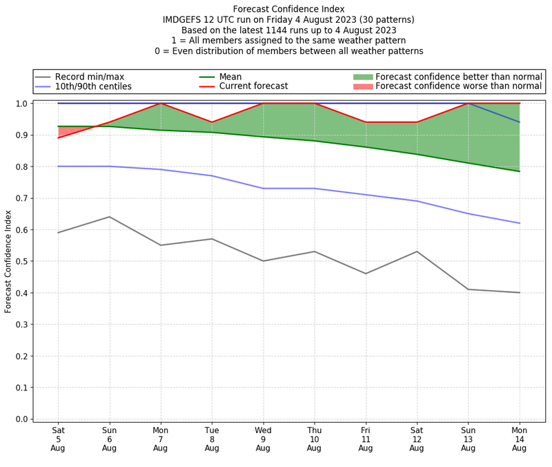 | Weather patterns typically associated with contrywide dry period tendencies over India are most likely Weather patterns 2, 3, 7, 8, 9, 16 and 20 (countrywide winter dry period) | |