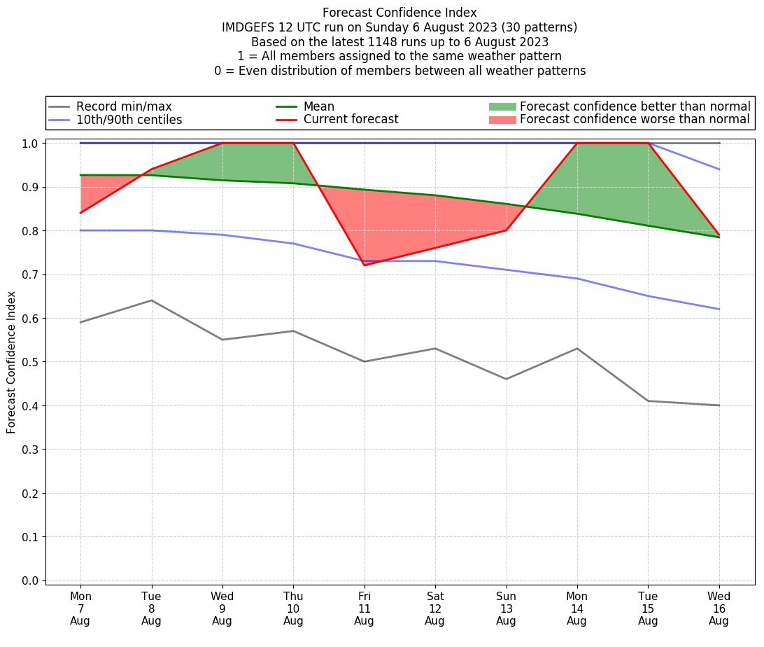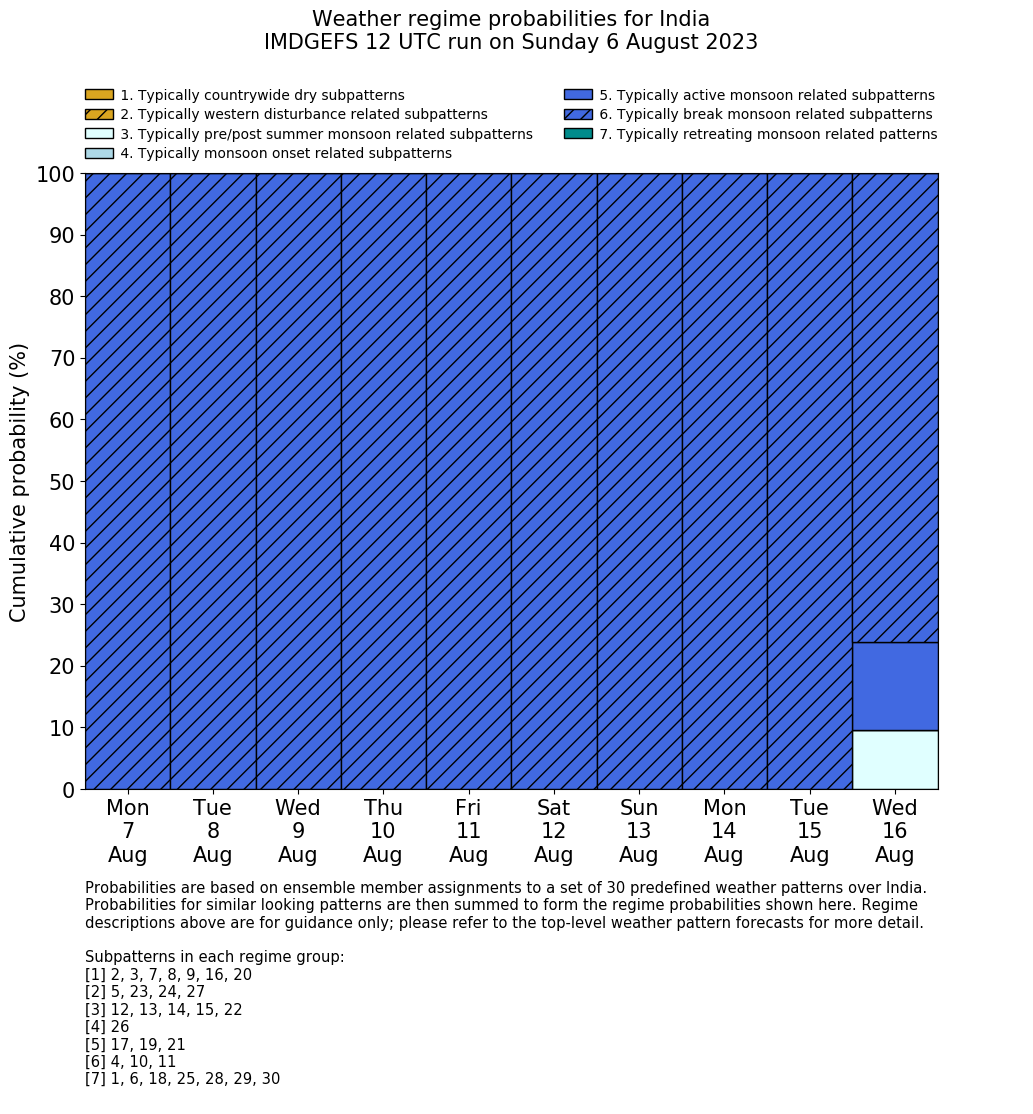 | Weather patterns typically associated with contrywide dry period tendencies over India are most likely Weather patterns 2, 3, 7, 8, 9, 16 and 20 (countrywide winter dry period) | |