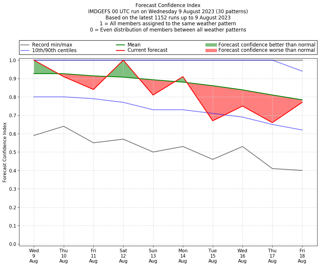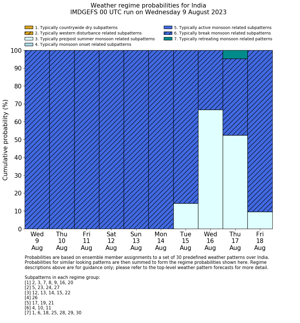 | Weather patterns typically associated with contrywide dry period tendencies over India are most likely Weather patterns 2, 3, 7, 8, 9, 16 and 20 (countrywide winter dry period) | |