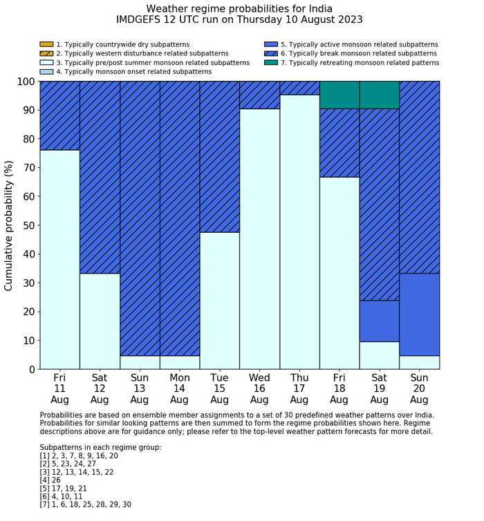 | Weather patterns typically associated with break monsoon tendencies over India are most likely Weather patterns 4, 10 and 11 (break) | |