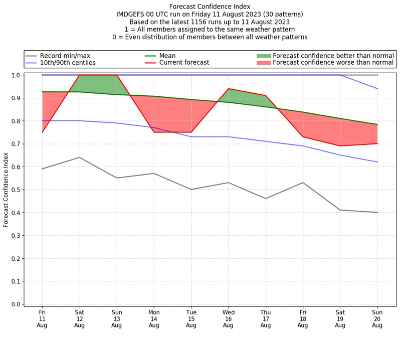 | Weather patterns typically associated with contrywide dry period tendencies over India are most likely Weather patterns 2, 3, 7, 8, 9, 16 and 20 (countrywide winter dry period) | |