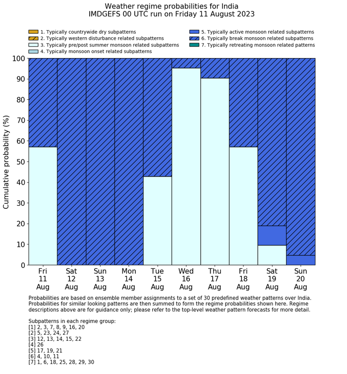 | Weather patterns typically associated with break monsoon tendencies over India are most likely Weather patterns 4, 10 and 11 (break) | |