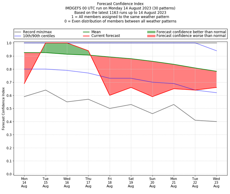 | Weather patterns typically associated with contrywide dry period tendencies over India are most likely Weather patterns 2, 3, 7, 8, 9, 16 and 20 (countrywide winter dry period) | |