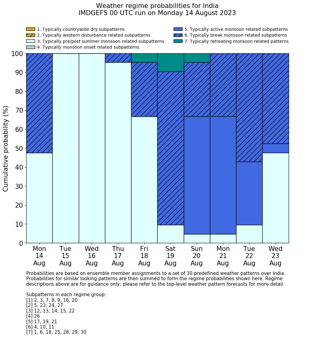 | Weather patterns typically associated with break monsoon tendencies over India are most likely Weather patterns 4, 10 and 11 (break) | |