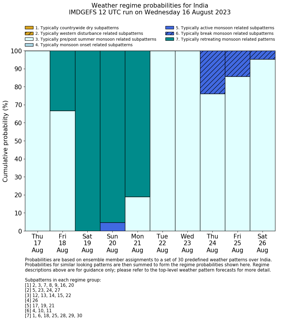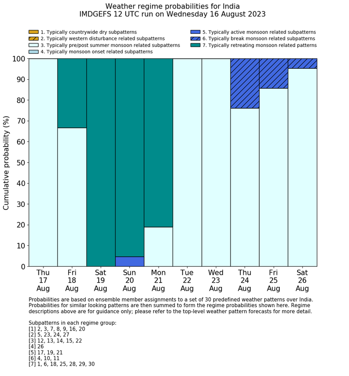 | Weather patterns typically associated with contrywide dry period tendencies over India are most likely Weather patterns 2, 3, 7, 8, 9, 16 and 20 (countrywide winter dry period) | |