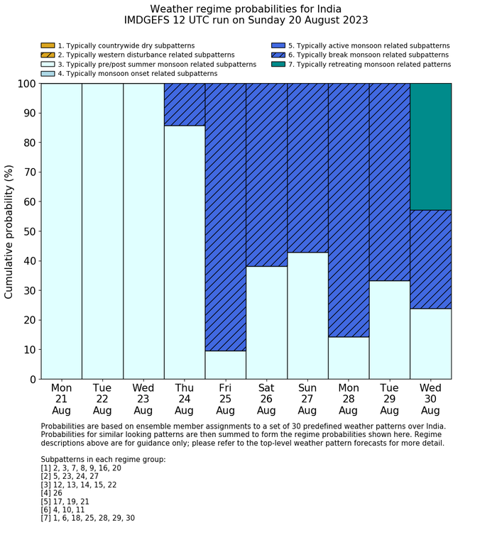 | Weather patterns typically associated with contrywide dry period tendencies over India are most likely Weather patterns 2, 3, 7, 8, 9, 16 and 20 (countrywide winter dry period) | |