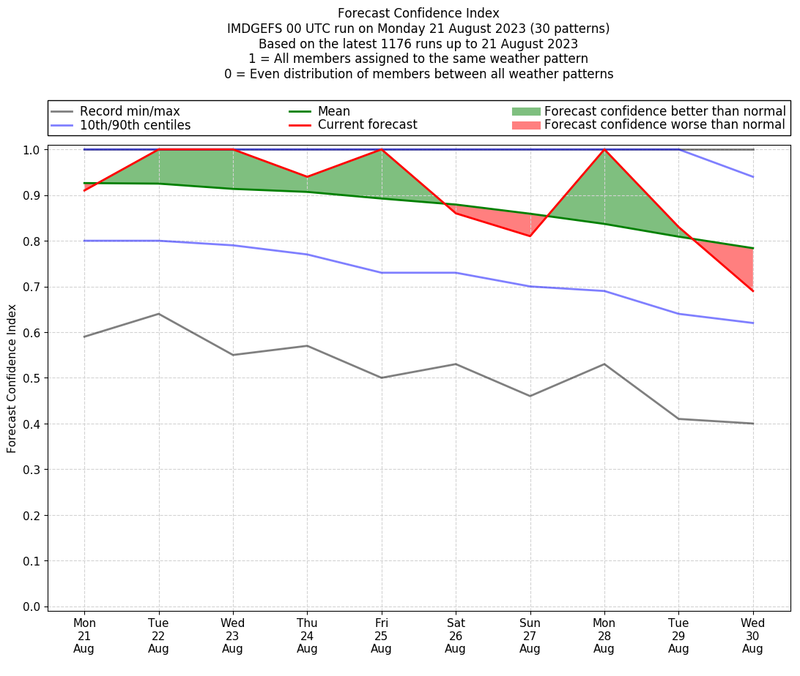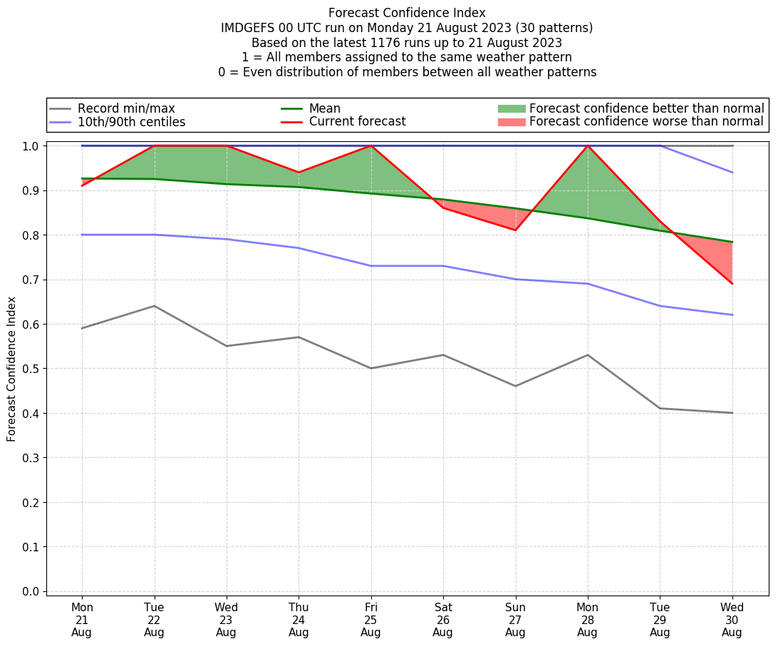 | Weather patterns typically associated with contrywide dry period tendencies over India are most likely Weather patterns 2, 3, 7, 8, 9, 16 and 20 (countrywide winter dry period) | |