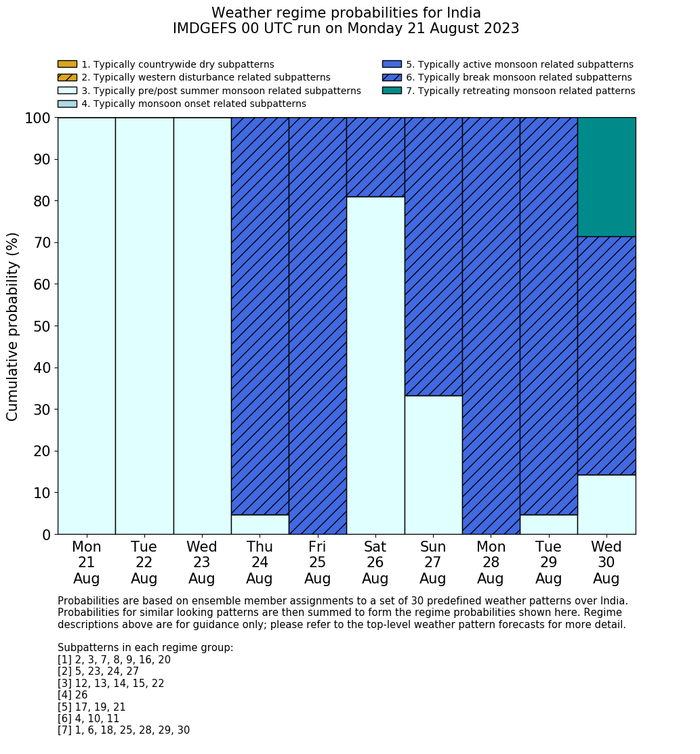 | Weather patterns typically associated with active monsoon tendencies over India are most likely Weather patterns 17, 19 and 21 (active) |