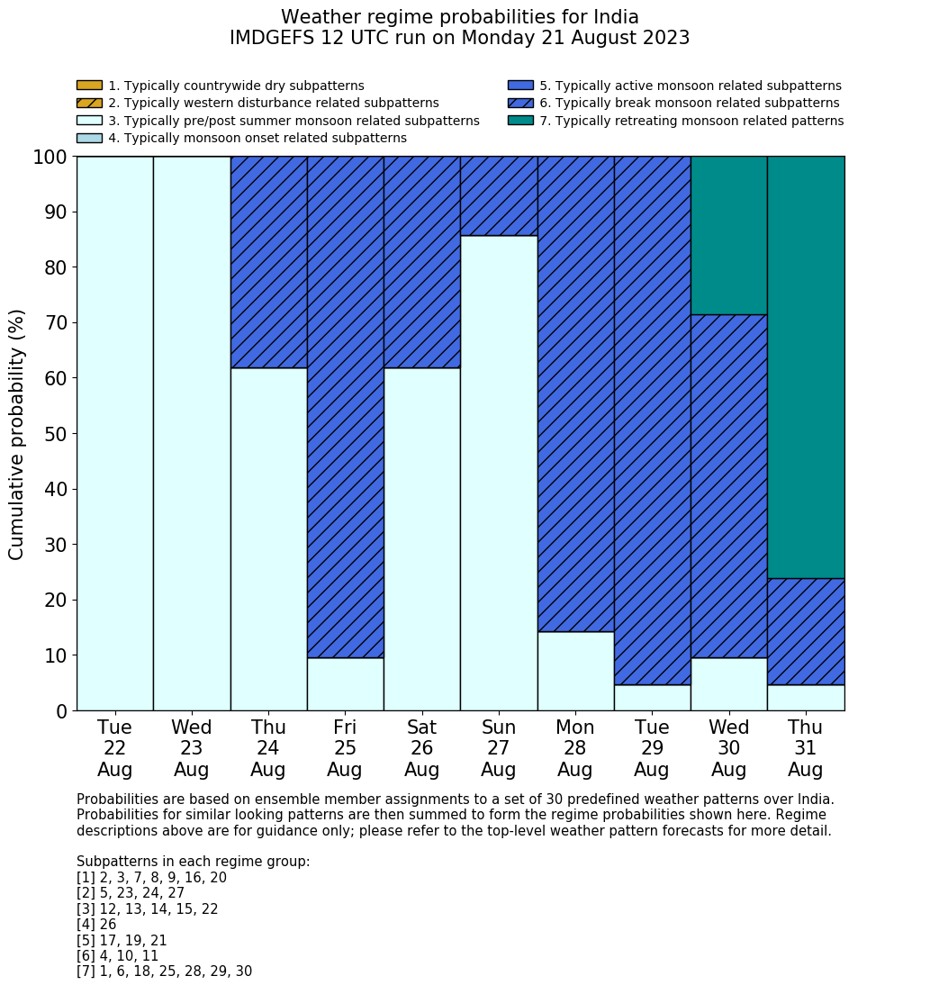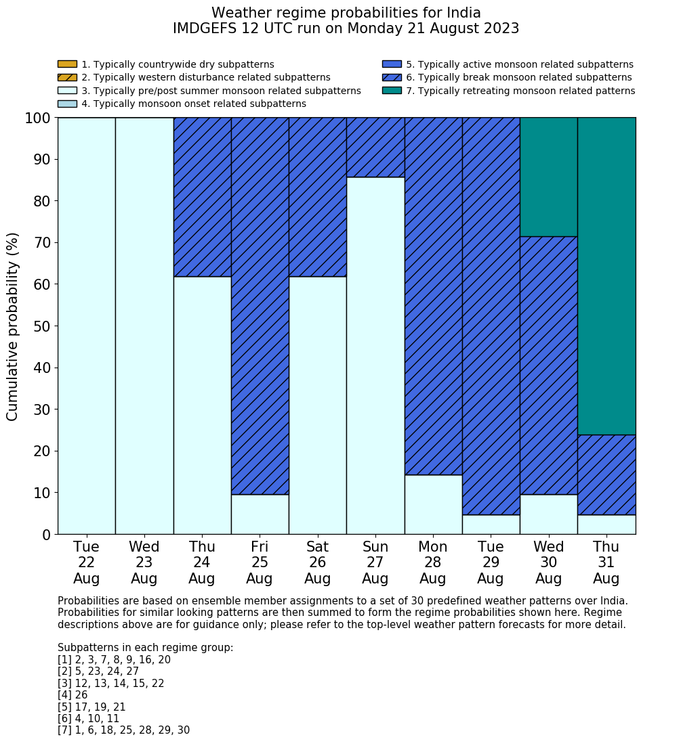 | Weather patterns typically associated with active monsoon tendencies over India are most likely Weather patterns 17, 19 and 21 (active) |