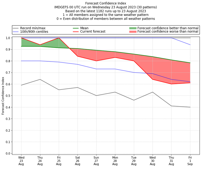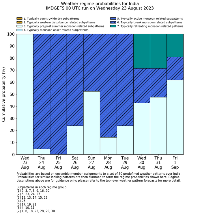 | Weather patterns typically associated with contrywide dry period tendencies over India are most likely Weather patterns 2, 3, 7, 8, 9, 16 and 20 (countrywide winter dry period) | |