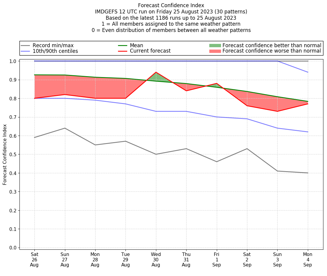 | Weather patterns typically associated with contrywide dry period tendencies over India are most likely Weather patterns 2, 3, 7, 8, 9, 16 and 20 (countrywide winter dry period) | |